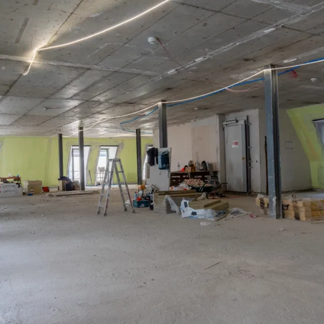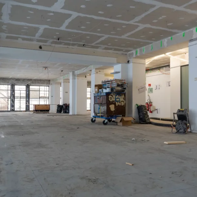 L’intervention comprend la coordination des corps de métier, les travaux techniques, les finitions intérieures ainsi que l’intégration de plafonds actifs afin de garantir des espaces modernes, fonctionnels et conformes aux exigences du projet.